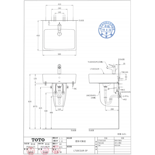 L710CGUR-SP 牌價:$10,000 產品規格 / 功能 尺寸:W55 xD45 cm 容量 : 6L 相關商品 (另購): 龍頭-TLS04301PD / 短腳-LW220HFG(NT$2,300) 備註:無障礙設施使用時(圖二),龍頭建議搭配為TWEL01N(A) ; 無障礙設施使用時,商品高度請參照尺寸圖