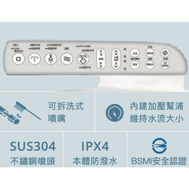 TAF200L(加長型) 牌價:$29,000 產品規格 / 功能 尺寸 : W48.7 xD54.5 xH15.4 cm(便座內徑:20.4 x30.1 cm) 電壓 : 110V 備註 : 適用水壓:0.75-7.5kgf/cm² ; 加熱方式 : 儲熱式